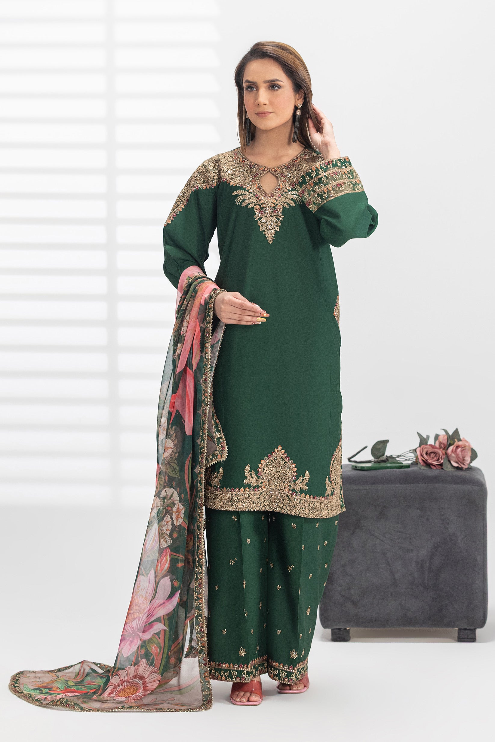 The set comes with a beautiful Chiffon Dupatta with Embroidery Borders .