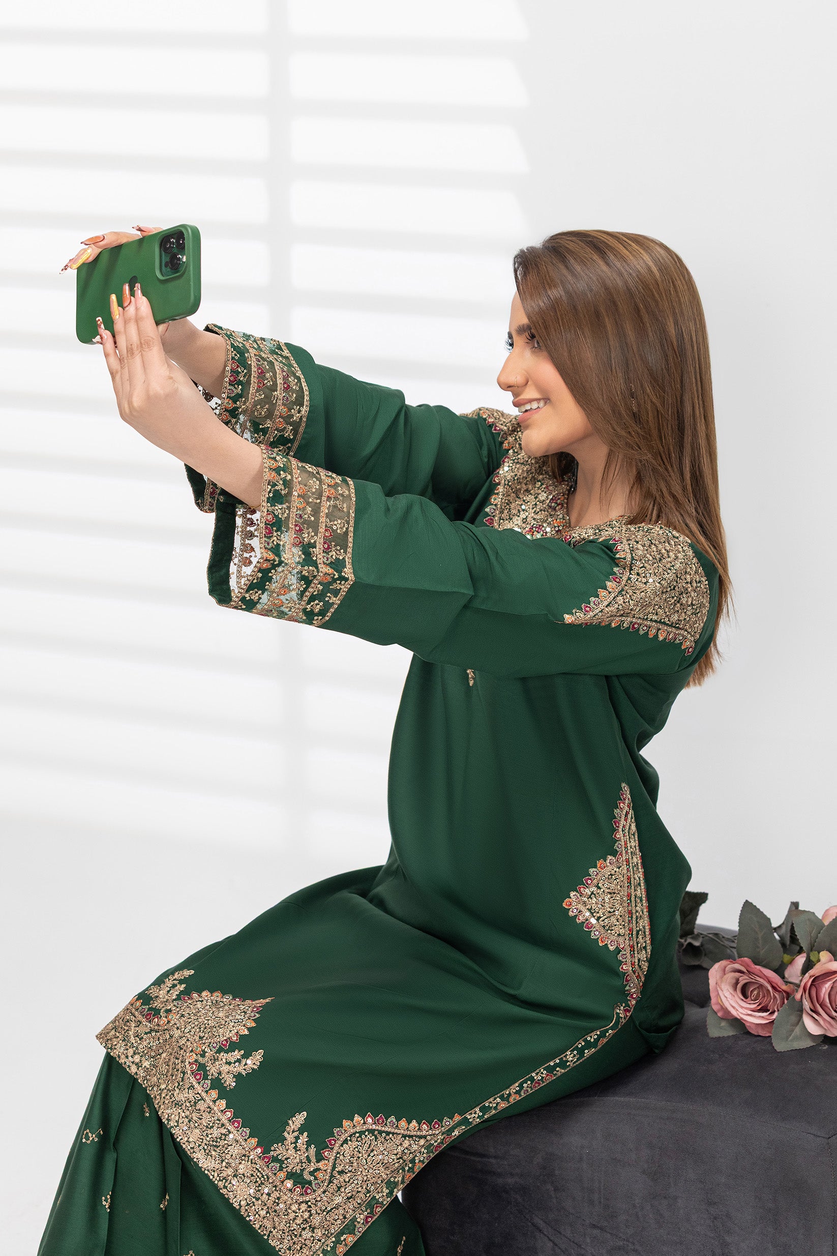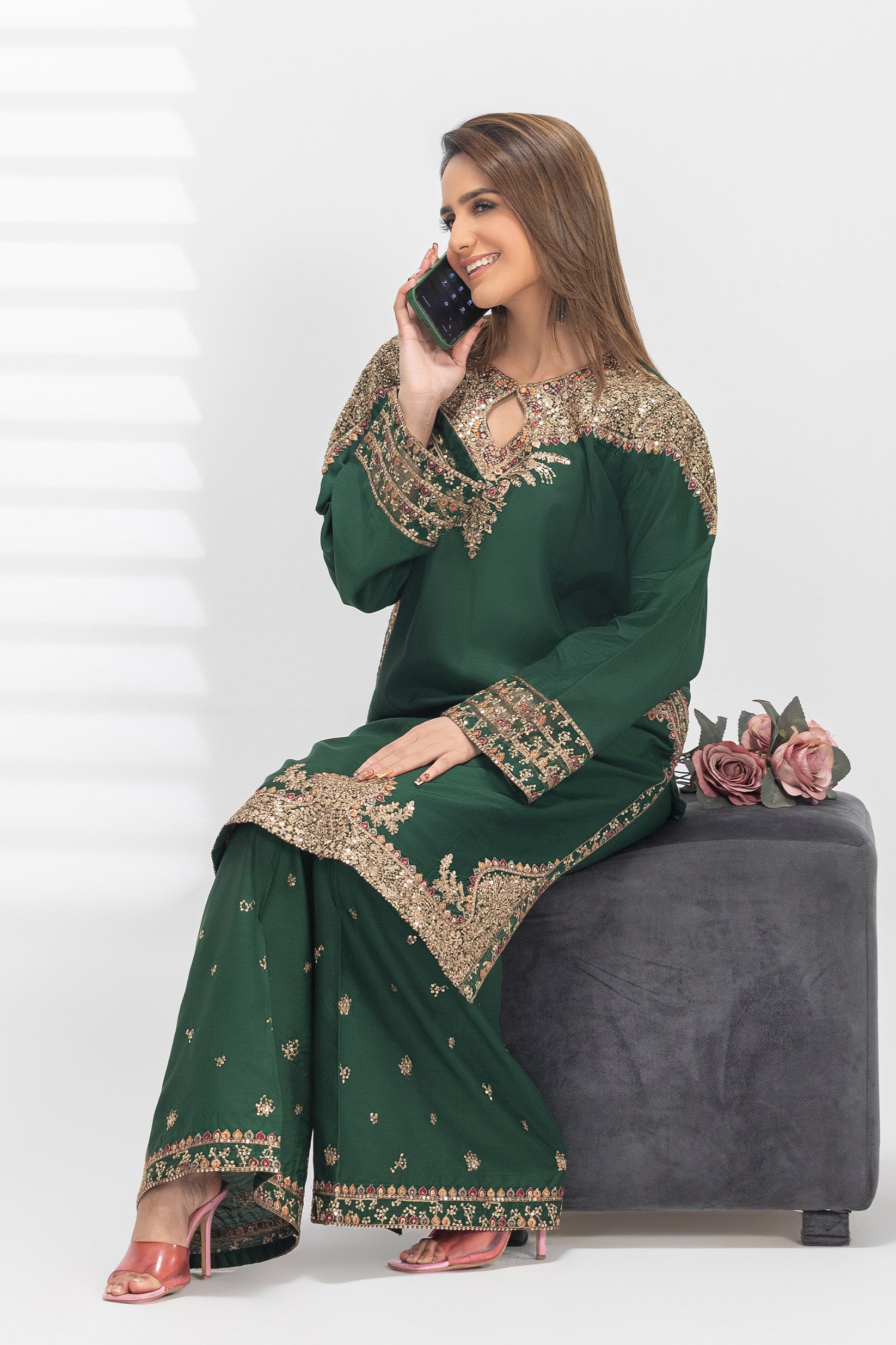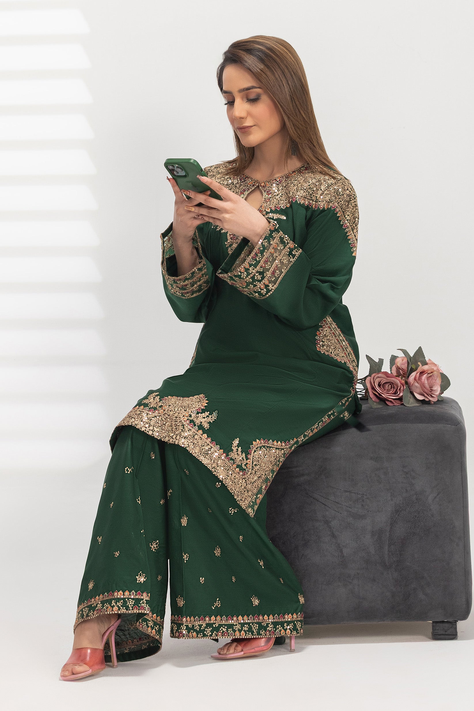 This shirt is crafted from premium Viscos fabric with a soft, breathable feel. It features full sequin embroidery on the arms, sleeves, and daman, giving it a rich and elegant look.