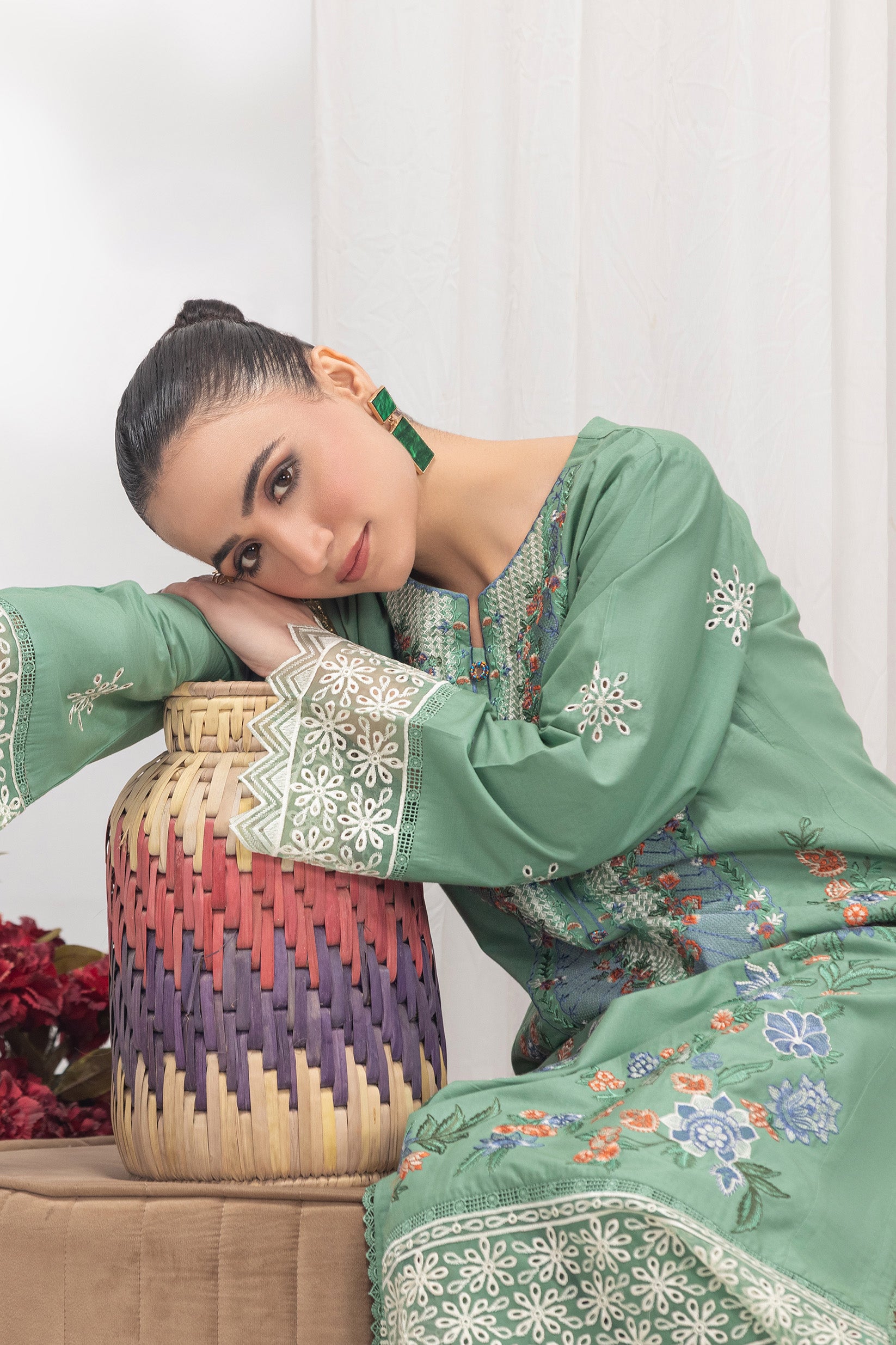This shirt is crafted from premium COTTON Lawn fabric with a soft, breathable feel. It features full sequence embroidery on the arms, sleeves, and daman, giving it a rich and elegant look.